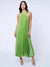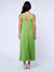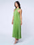 The Pleated Mellisa Dress in Matcha in a rich matcha green features a beautifully structured halter neckline with wide straps that cross in front, creating a flattering, elevated silhouette. Soft pleating flows effortlessly from top to hem, giving it movement with every step (and yes, it does that pretty swish when you walk).
