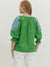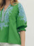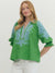 This solid green woven top features intricate light blue embroidery across the neckline and sleeves, creating a beautiful contrast that feels both classic and eye-catching. The split V-neckline is finished with coordinating contrast binding, while the 3/4 length sleeves are accented with elasticated cuffs for a soft, slightly billowed silhouette.