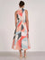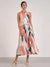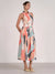 This sleeveless collared dress by Elan features a striking prism-inspired print in soft coral, muted teal, cream, and charcoal tones. The tailored shirt-style bodice is finished with a classic collar and button-front detail, giving it a structured, timeless feel.